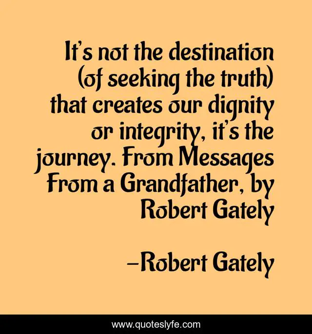 This page presents the quote "It’s not the destination (of seeking the truth) that creates our dignity or integrity, it’s the journey. From Messages From a Grandfather, by Robert Gately". Author of this quote is Robert Gately. This quote is about dignity, destination, grandfatherly-advice, fillossofee-ebook, quote, philosophy, wisdom, journey, truth,.