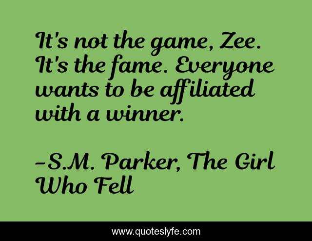 This page presents the quote "It's not the game, Zee. It's the fame. Everyone wants to be affiliated with a winner.". Author of this quote is S.M. Parker, The Girl Who Fell. This quote is about game, winner, fame,.