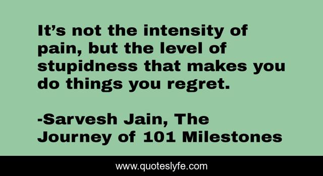 This page presents the quote "It’s not the intensity of pain, but the level of stupidness that makes you do things you regret.". Author of this quote is Sarvesh Jain, The Journey of 101 Milestones. This quote is about painful-memories, regrets,.