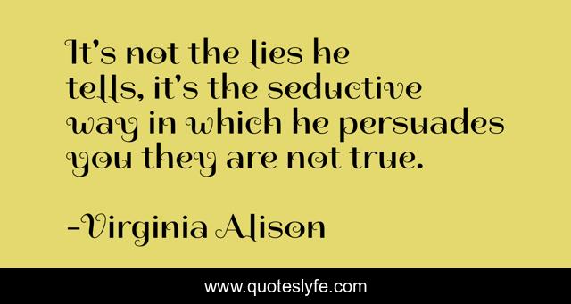 This page presents the quote "It's not the lies he tells, it's the seductive way in which he persuades you they are not true.". Author of this quote is Virginia Alison. This quote is about lies, persuade, seduction,.