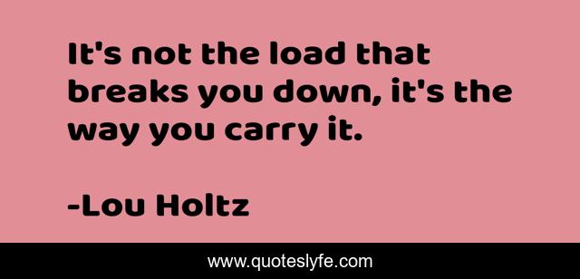This page presents the quote "It's not the load that breaks you down, it's the way you carry it.". Author of this quote is Lou Holtz. This quote is about motivation, inspiration,.