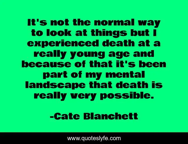 This page presents the quote "It's not the normal way to look at things but I experienced death at a really young age and because of that it's been part of my mental landscape that death is really very possible.". Author of this quote is Cate Blanchett. This quote is about age, look, landscape,.
