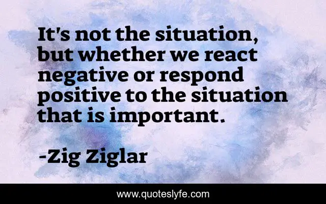 This page presents the quote "It's not the situation, but whether we react negative or respond positive to the situation that is important.". Author of this quote is Zig Ziglar. This quote is about react, situation, negative,.