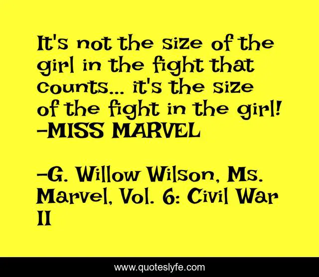 This page presents the quote "It's not the size of the girl in the fight that counts... it's the size of the fight in the girl! -MISS MARVEL". Author of this quote is G. Willow Wilson, Ms. Marvel, Vol. 6: Civil War II. This quote is about woman-up, belief, girl-power, powerful, fight, justice, inner-strength,.