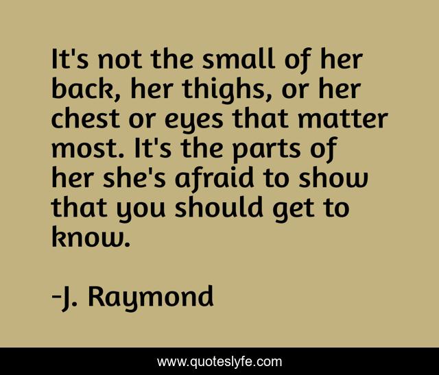 This page presents the quote "It's not the small of her back, her thighs, or her chest or eyes that matter most. It's the parts of her she's afraid to show that you should get to know.". Author of this quote is J. Raymond. This quote is about romance, woman, thought-provoking,.