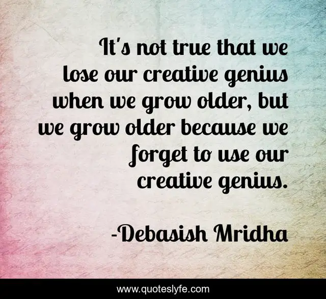 This page presents the quote "It's not true that we lose our creative genius when we grow older, but we grow older because we forget to use our creative genius.". Author of this quote is Debasish Mridha. This quote is about life, love, knowledge, inspirational, intelligence, philosophy, wisdom, quotes, affection,.