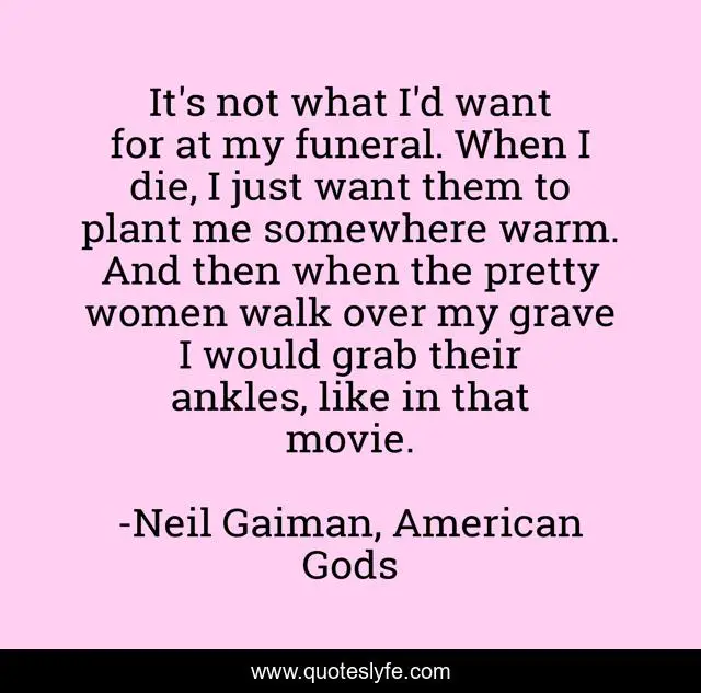 This page presents the quote "It's not what I'd want for at my funeral. When I die, I just want them to plant me somewhere warm. And then when the pretty women walk over my grave I would grab their ankles, like in that movie.". Author of this quote is Neil Gaiman, American Gods. This quote is about humorous, after-death, death, funerals,.