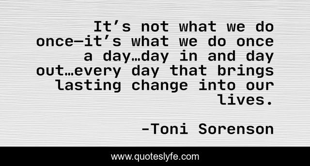 This page presents the quote "It’s not what we do once—it’s what we do once a day…day in and day out…every day that brings lasting change into our lives.". Author of this quote is Toni Sorenson. This quote is about life, consistency, health, fitness, change, inspiration,.