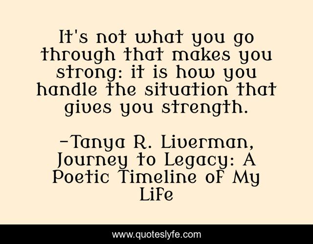 This page presents the quote "It's not what you go through that makes you strong: it is how you handle the situation that gives you strength.". Author of this quote is Tanya R. Liverman, Journey to Legacy: A Poetic Timeline of My Life. This quote is about enthusiasm, poetry, inspirational,.