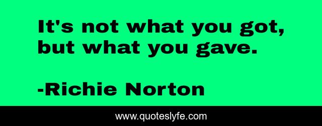 This page presents the quote "It's not what you got, but what you gave.". Author of this quote is Richie Norton. This quote is about confidence, self-mastery, mindful, marketing, work, success, self-help, entrepreneur, innovation,.