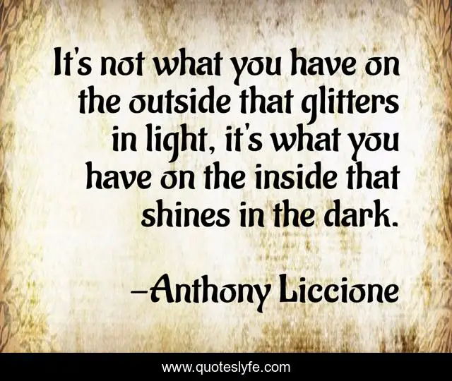 This page presents the quote "It's not what you have on the outside that glitters in light, it's what you have on the inside that shines in the dark.". Author of this quote is Anthony Liccione. This quote is about shine, rich-and-pride, spiritual, bling, darkness-and-light, jewelry, flesh, money, poor-and-humble,.