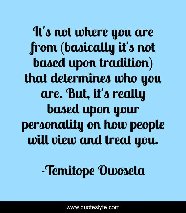 This page presents the quote "It's not where you are from (basically it's not based upon tradition) that determines who you are. But, it's really based upon your personality on how people will view and treat you.". Author of this quote is Temitope Owosela. This quote is about viewpoint, people, people-person, treatment, view, personality,.