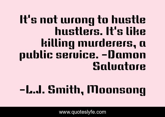 This page presents the quote "It's not wrong to hustle hustlers. It's like killing murderers, a public service. -Damon Salvatore". Author of this quote is L.J. Smith, Moonsong. This quote is about elena-gilbert, damon-salvatore, humor, diaries, stefan, stefan-salvatore, vampire, elena, l-j-smith,.