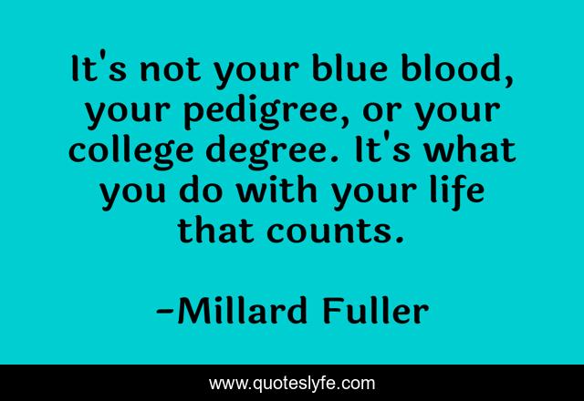 This page presents the quote "It's not your blue blood, your pedigree, or your college degree. It's what you do with your life that counts.". Author of this quote is Millard Fuller. This quote is about college-degree, station, life, pedigree, inspiration,.
