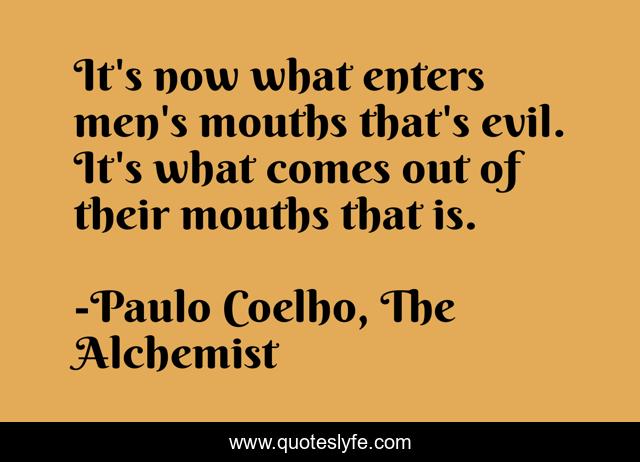 This page presents the quote "It's now what enters men's mouths that's evil. It's what comes out of their mouths that is.". Author of this quote is Paulo Coelho, The Alchemist. This quote is about tongue, mouth, evil, language,.
