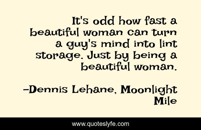 This page presents the quote "It's odd how fast a beautiful woman can turn a guy's mind into lint storage. Just by being a beautiful woman.". Author of this quote is Dennis Lehane, Moonlight Mile. This quote is about lehane, moonlight-mile, women,.