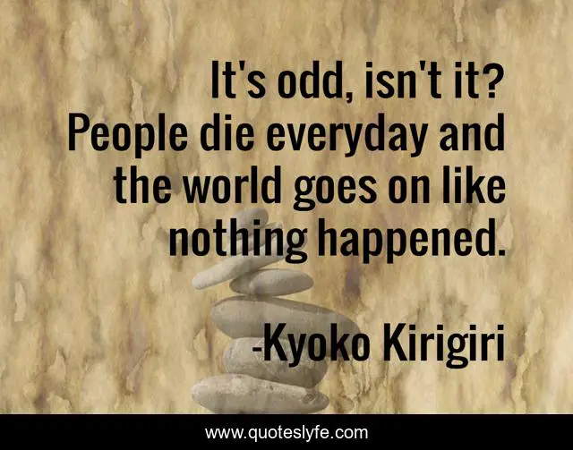 This page presents the quote "It's odd, isn't it? People die everyday and the world goes on like nothing happened.". Author of this quote is Kyoko Kirigiri. This quote is about society, death, manga, world,.