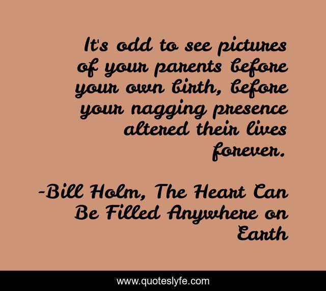 This page presents the quote "It's odd to see pictures of your parents before your own birth, before your nagging presence altered their lives forever.". Author of this quote is Bill Holm, The Heart Can Be Filled Anywhere on Earth. This quote is about parenting, kids,.