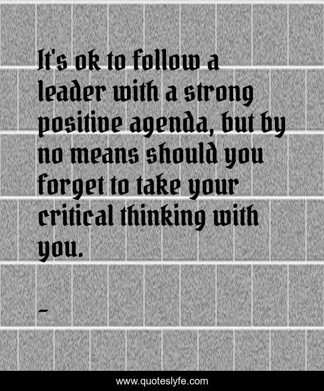 This page presents the quote "It's ok to follow a leader with a strong positive agenda, but by no means should you forget to take your critical thinking with you.". Author of this quote is . This quote is about edmond-mbiaka, follow, thinking-critically, critical-thinking, following,.