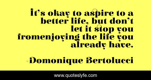 This page presents the quote "It’s okay to aspire to a better life, but don’t let it stop you fromenjoying the life you already have.". Author of this quote is Domonique Bertolucci. This quote is about life-coaching, motivation, how-to-be-happier, life-coach, be-happy, how-to-be-happy, happiness-advice, happiness, be-more-motivated,.