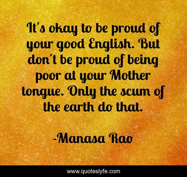 This page presents the quote "It's okay to be proud of your good English. But don't be proud of being poor at your Mother tongue. Only the scum of the earth do that.". Author of this quote is Manasa Rao. This quote is about english, pride, mother-tongue, insult,.