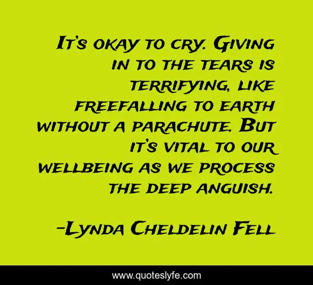 This page presents the quote "It’s okay to cry. Giving in to the tears is terrifying, like freefalling to earth without a parachute. But it’s vital to our wellbeing as we process the deep anguish.". Author of this quote is Lynda Cheldelin Fell. This quote is about grief, grief-and-loss, crying, grief-inspirational,.