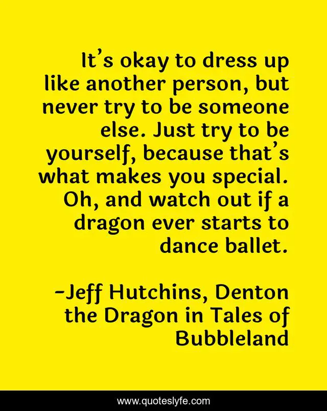 This page presents the quote "It’s okay to dress up like another person, but never try to be someone else. Just try to be yourself, because that’s what makes you special. Oh, and watch out if a dragon ever starts to dance ballet.". Author of this quote is Jeff Hutchins, Denton the Dragon in Tales of Bubbleland. This quote is about kids-books, children-s-literature, children-s-books, contemporary, fiction, children-s-fiction, learning, reading,.