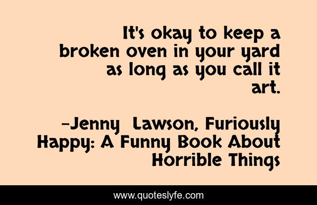 This page presents the quote "It's okay to keep a broken oven in your yard as long as you call it art.". Author of this quote is Jenny Lawson, Furiously Happy: A Funny Book About Horrible Things. This quote is about art, yard, jenny-lawson, broken, oven, humor, yard-art,.