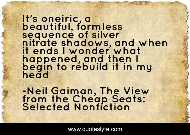 This page presents the quote "It's oneiric, a beautiful, formless sequence of silver nitrate shadows, and when it ends I wonder what happened, and then I begin to rebuild it in my head". Author of this quote is Neil Gaiman, The View from the Cheap Seats: Selected Nonfiction. This quote is about dreams, film,.