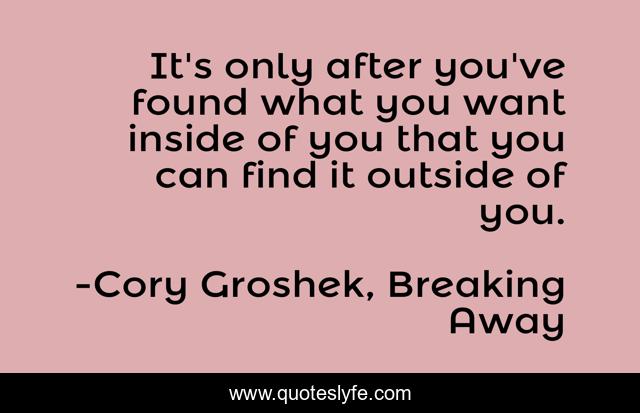 This page presents the quote "It's only after you've found what you want inside of you that you can find it outside of you.". Author of this quote is Cory Groshek, Breaking Away. This quote is about manifestation-of-your-dream, manifesting, inside-of-you, what-s-inside-that-counts, inside, outside, manifesting-desires, outside-of-you, manifestation,.