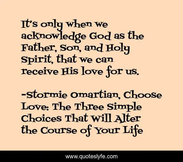This page presents the quote "It’s only when we acknowledge God as the Father, Son, and Holy Spirit, that we can receive His love for us.". Author of this quote is Stormie Omartian, Choose Love: The Three Simple Choices That Will Alter the Course of Your Life. This quote is about confidence, god, motivational, christianity, christian-living, inspirational, positive, enthusiasm, holy-spirit,.