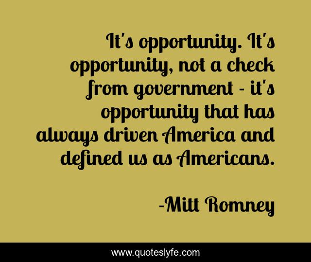This page presents the quote "It's opportunity. It's opportunity, not a check from government - it's opportunity that has always driven America and defined us as Americans.". Author of this quote is Mitt Romney. This quote is about america, opportunity, check,.