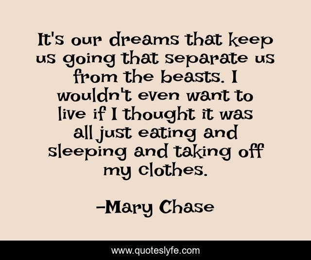 This page presents the quote "It's our dreams that keep us going that separate us from the beasts. I wouldn't even want to live if I thought it was all just eating and sleeping and taking off my clothes.". Author of this quote is Mary Chase. .