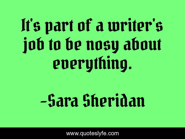 This page presents the quote "It's part of a writer's job to be nosy about everything.". Author of this quote is Sara Sheridan. This quote is about nosy, job, writer, curiosity, writing,.