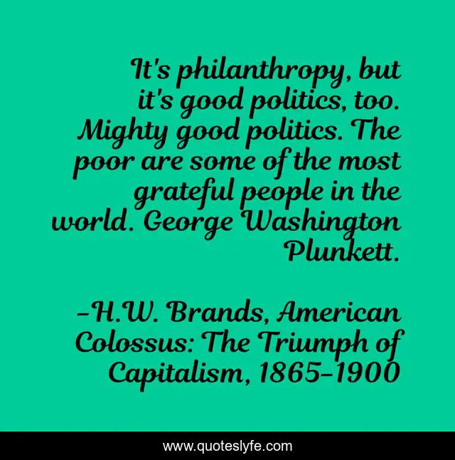 This page presents the quote "It's philanthropy, but it's good politics, too. Mighty good politics. The poor are some of the most grateful people in the world. George Washington Plunkett.". Author of this quote is H.W. Brands, American Colossus: The Triumph of Capitalism, 1865-1900. This quote is about learned-helplessness, materialism, welfare-state, loyalty,.