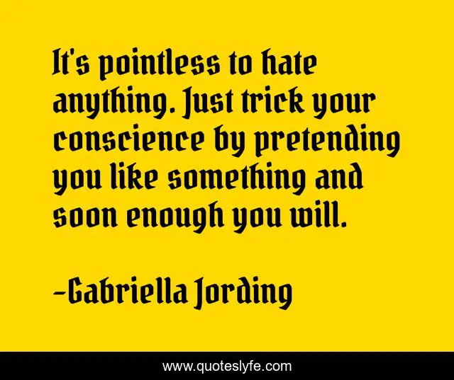 This page presents the quote "It's pointless to hate anything. Just trick your conscience by pretending you like something and soon enough you will.". Author of this quote is Gabriella Jording. This quote is about conscience, hate, pretend, pointless,.