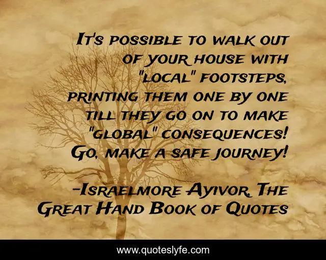 This page presents the quote "It's possible to walk out of your house with "local" footsteps, printing them one by one till they go on to make "global" consequences! Go, make a safe journey!". Author of this quote is Israelmore Ayivor, The Great Hand Book of Quotes. This quote is about food-for-thought, global, footsteps, consequences, foot, house, safe, 1-by-1, walk,.