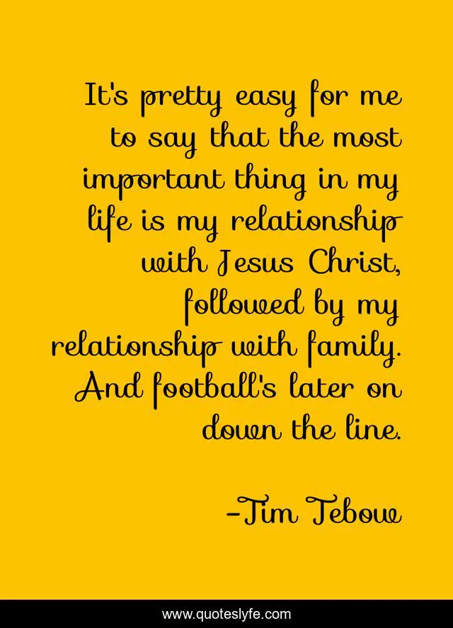 This page presents the quote "It's pretty easy for me to say that the most important thing in my life is my relationship with Jesus Christ, followed by my relationship with family. And football's later on down the line.". Author of this quote is Tim Tebow. This quote is about life, football, family,.