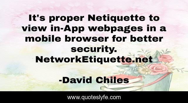 This page presents the quote "It's proper Netiquette to view in-App webpages in a mobile browser for better security. NetworkEtiquette.net". Author of this quote is David Chiles. This quote is about etiquette, computer, network, mobile, internet-etiquette, netiquette, internet-security, safety, mobile-security,.