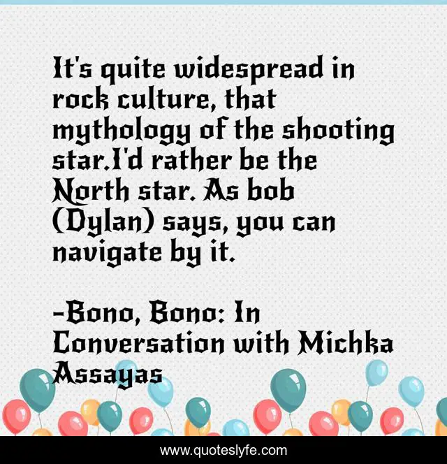 This page presents the quote "It's quite widespread in rock culture, that mythology of the shooting star.I'd rather be the North star. As bob (Dylan) says, you can navigate by it.". Author of this quote is Bono, Bono: In Conversation with Michka Assayas. This quote is about myths, fame, stars,.