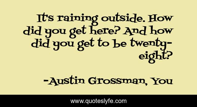 This page presents the quote "It's raining outside. How did you get here? And how did you get to be twenty-eight?". Author of this quote is Austin Grossman, You. This quote is about raining, russell-marsh, twenty-eight-years-old, rain, introspection, twenty-eight,.