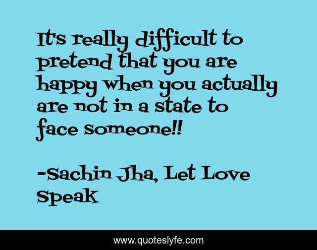 This page presents the quote "It's really difficult to pretend that you are happy when you actually are not in a state to face someone!!". Author of this quote is Sachin Jha, Let Love Speak. This quote is about inspirational, love, romantic, affection, enthusiasm,.