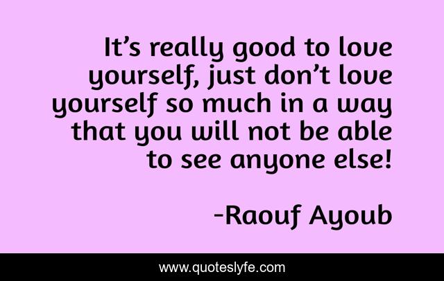 This page presents the quote "It’s really good to love yourself, just don’t love yourself so much in a way that you will not be able to see anyone else!". Author of this quote is Raouf Ayoub. This quote is about selfishness, love, affection, love-yourself,.