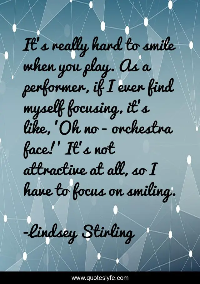 This page presents the quote "It's really hard to smile when you play. As a performer, if I ever find myself focusing, it's like, 'Oh no - orchestra face!' It's not attractive at all, so I have to focus on smiling.". Author of this quote is Lindsey Stirling. This quote is about myself, smiling, focus,.