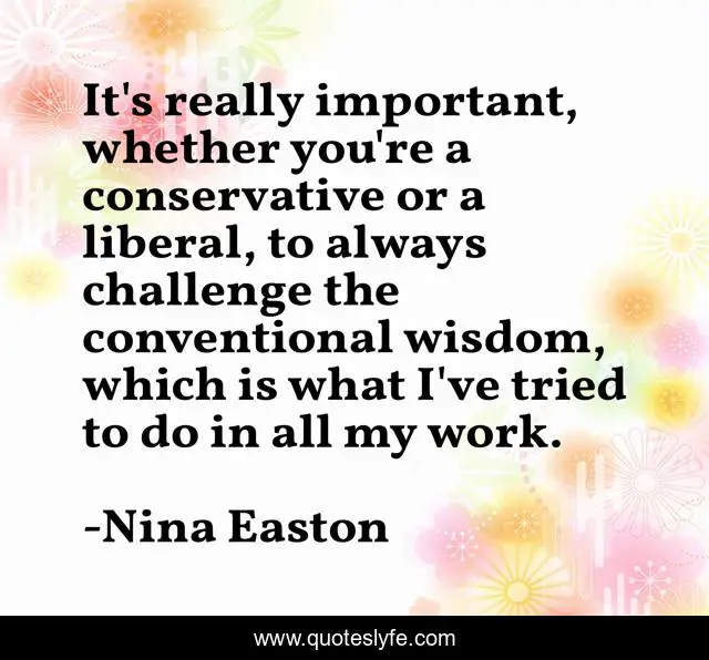 This page presents the quote "It's really important, whether you're a conservative or a liberal, to always challenge the conventional wisdom, which is what I've tried to do in all my work.". Author of this quote is Nina Easton. This quote is about challenge, work,.