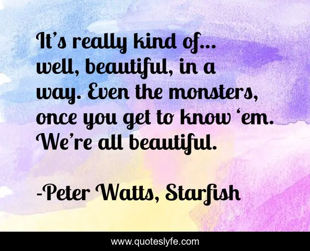 This page presents the quote "It’s really kind of… well, beautiful, in a way. Even the monsters, once you get to know ‘em. We’re all beautiful.". Author of this quote is Peter Watts, Starfish. This quote is about monsters, beauty,.