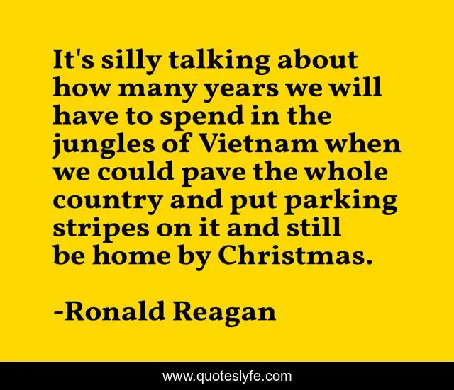 This page presents the quote "It's silly talking about how many years we will have to spend in the jungles of Vietnam when we could pave the whole country and put parking stripes on it and still be home by Christmas.". Author of this quote is Ronald Reagan. This quote is about home, silly, country,.