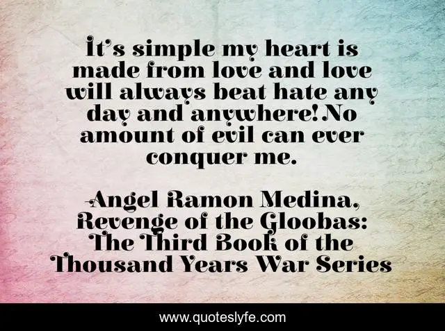 This page presents the quote "It’s simple my heart is made from love and love will always beat hate any day and anywhere! No amount of evil can ever conquer me.". Author of this quote is Angel Ramon Medina, Revenge of the Gloobas: The Third Book of the Thousand Years War Series. This quote is about love-conquers-all, science-fiction-romance, postive, hate-to-love, love, affection,.