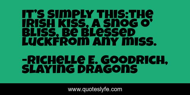 This page presents the quote "It’s simply this:the Irish kiss, a snog o’ bliss, be blessed luckfrom any miss.". Author of this quote is Richelle E. Goodrich, Slaying Dragons. This quote is about irish-kiss, irish, richelle-e-goodrich, irish-romance, richelle, st-patrick-s-day, richelle-goodrich, good-luck, luck,.