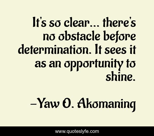 This page presents the quote "It's so clear... there's no obstacle before determination. It sees it as an opportunity to shine.". Author of this quote is Yaw O. Akomaning. This quote is about inspirational-life, obstacle,.